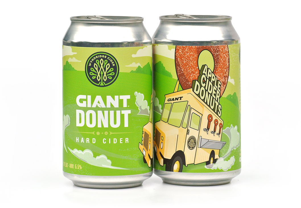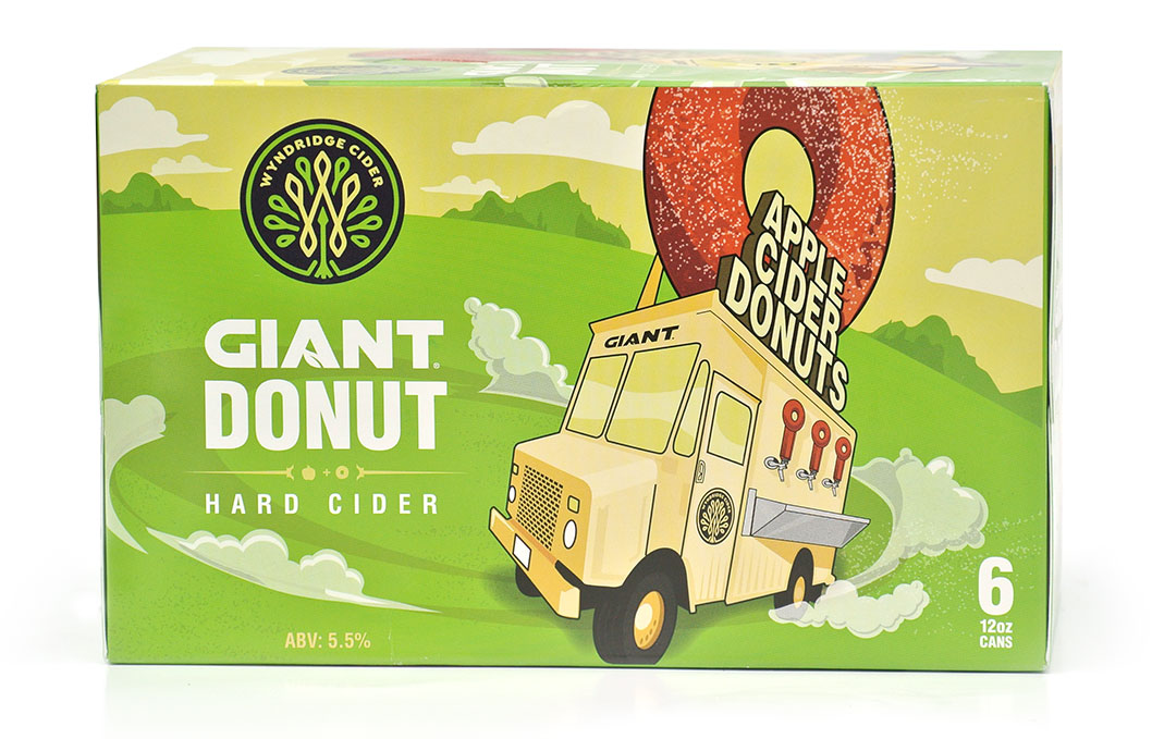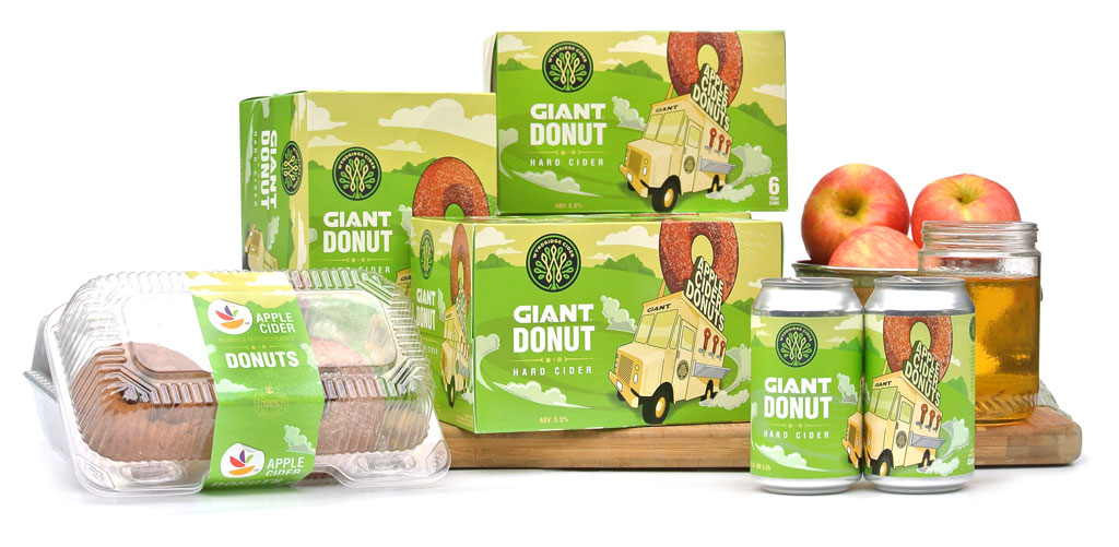 Since early 2020 The GIANT Company has continued to partner with local craft breweries building a line of co-branded ales that provides unique offerings within their beer gardens. In 2021 the collaboration expanded the into the world of hard cider with Wyndridge Farm and Giant Donut! Packaging features a Giant donut truck, with a giant donut on top, doing a giant donut! The cider was merchandised with fresh apple cider donuts from Giant’s bakery in matching branding. So consumers could buy cider flavored donuts with donut flavored cider.